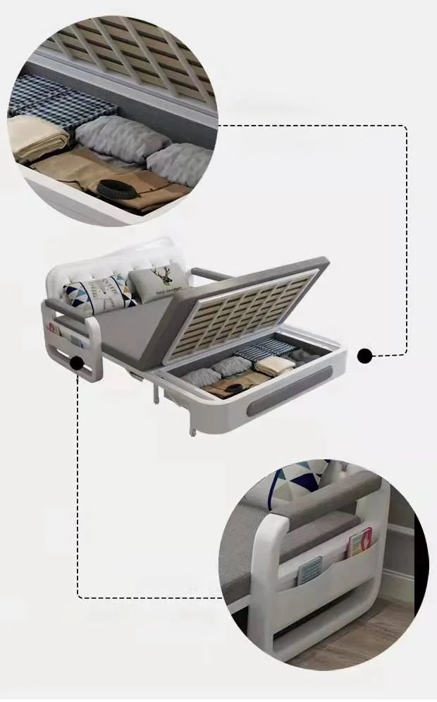 There is a Large Storage space under the bed/sofa that you can store Sheets and blankets/clothes. And there are 2 pockets for bedside or sofa storage.