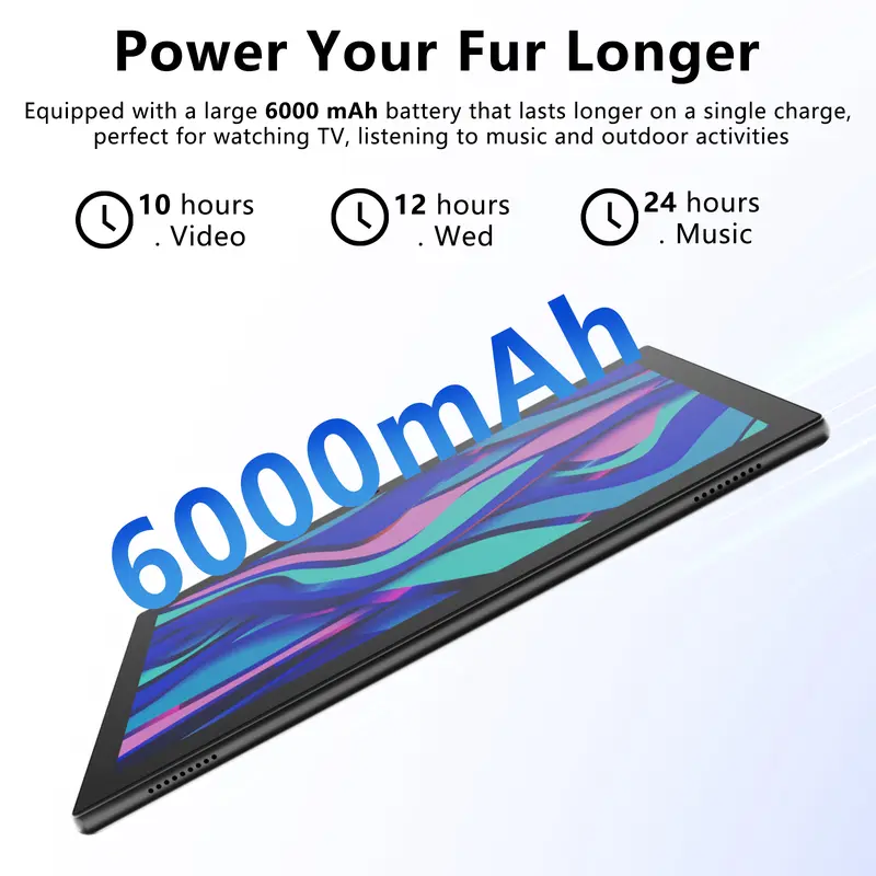 ·【2.4G/5G Wi-Fi 6.0+6000mAH Battery】 10 inch Wifi tablet support 5Ghz Wi-Fi 6 or 2.4Ghz, it has a more stable wireless signal, achieves faster transmission speed, and makes wireless devices more power-saving. In addition, it is equipped with a 6000mah battery, a single charge can last up to 10 hours, perfect for long-distance commuting and travel, reading, watching movies, dramas, listening to music and so on.