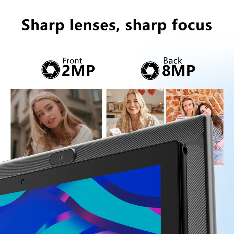 ·【10.1 inch Touchscreen & HD Camera】 The android 15.0 tablet has a 10.1 in IPS display, 1280x800 resolution, a tablet with sensitive screen sensing, equipped with 8MP+2MP dual cameras, narrow edge screen design. The high-definition screen brings you more detailed natural colors and advanced visual effects. The "reading mode" can reduce harmful light to the eyes so you get to enjoy a comfortable night reading.