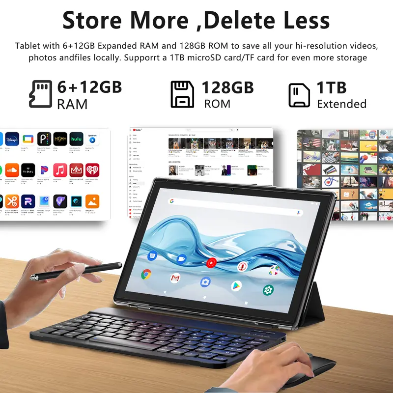 ·【18GB RAM+128GB ROM+1TB Expandable】 Our YQ10SMAX android 15 tablet PC built-in a powerful storage combination of 18GB RAM ( 6GB + 12GB achieved through expansion technology ) and 128GB ROM, comes with new generation ultra-high performance and low power consumption 2.0GHz Processor, achieve faster and more stable running and storage speeds. In addition, it can be expanded up to 1TB with a microSD card (card not included) for even more storage.