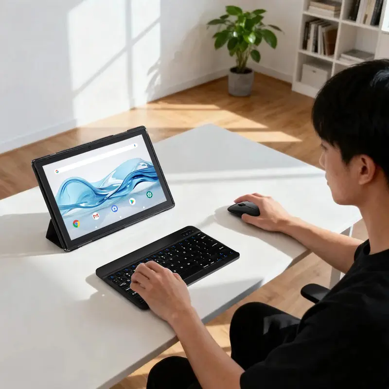·【Portable 2 in 1 Tablet with Keyboard】 This 10.1 inch android tablet equipped with a bluetooth keyboard, wireless mouse, and stylus as well as a foldable protective case, allowing you to seamlessly transform your 10'' tablet into a laptop-style device. This versatility makes it the ideal device for those who need to be productive on the go, whether it be for work, study, or play.