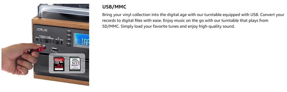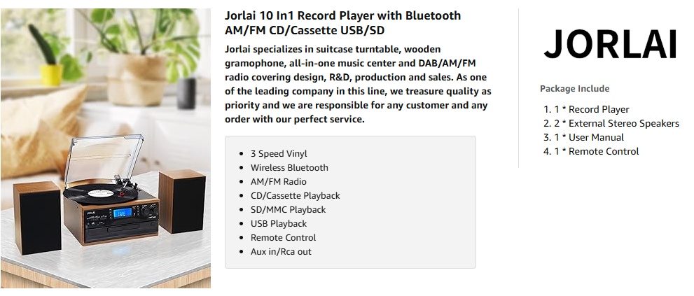 The vinyl record player with dual stereo speakers that combines old-school gramophone turntable and modern bluetooth technology. It can feature 3 speed (33 , 45, 78 RPM) records to play all your favourite songs. The all in one record player with am fm radio, bluetooth, usb/sd, cd/cassette, aux-in/rca line out and remote control can meet all your demands. Putting a turntable on a party table to play great music to share with friends is the perfect gift for friends and family.