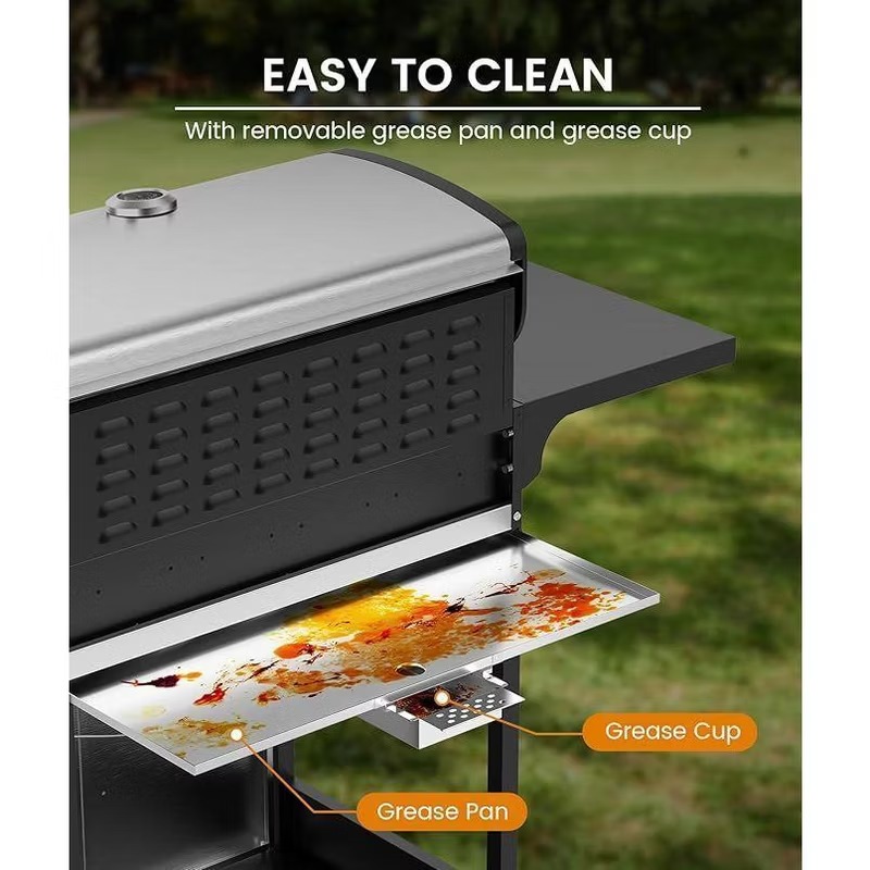 Easy Cleanup & Smart Storage Solutions:The removable grease tray features specially designed grooves that efficiently collect oil and food residue, making cleanup quick and hassle-free. Simply slide out the tray for easy washing. For added convenience, the grill includes bottom storage space and side hooks—perfect for organizing grill tools, seasonings, or even a propane tank—keeping everything you need within reach.