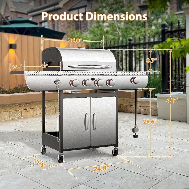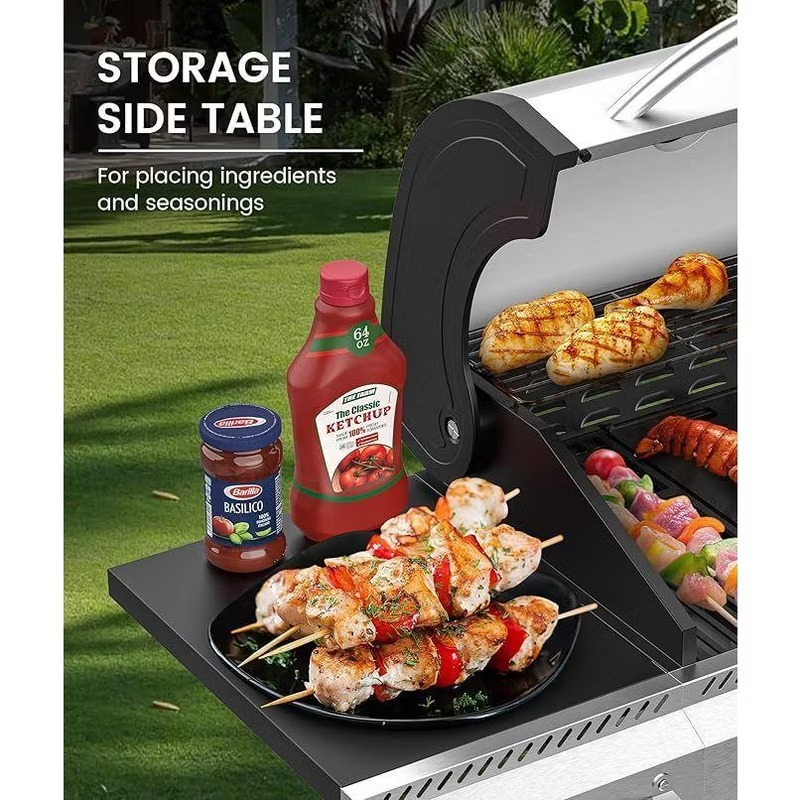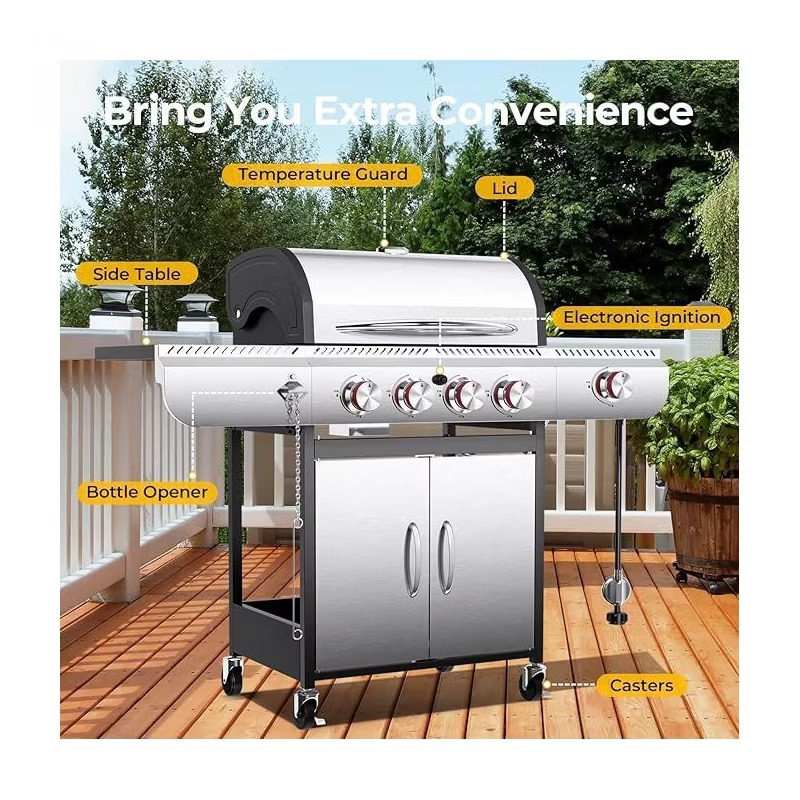 High-Performance Heat with 5 Powerful Burners:Designed for efficiency and power, this BBQ grill features five stainless steel burners that deliver a total of 42,000 BTUs. It includes four main burners, each producing 8,000 BTUs, plus a lidded side burner with 10,000 BTUs—ideal for side dishes or sauces. The burners ensure fast preheating and even heat distribution across the grill, giving you consistently great cooking results every time.