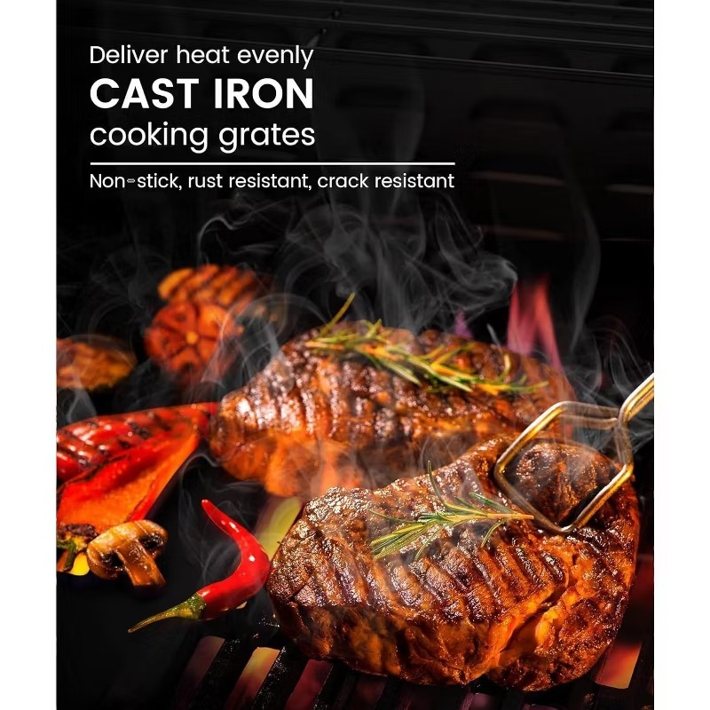 Durable Stainless Steel Build with Cast Iron Grates:This propane grill features a full AISI stainless steel construction for lasting strength and performance. The upper section—including the grilling area, side burners, and side tables—is made from premium AISI 304 stainless steel, known for its excellent corrosion resistance. The main body is constructed from sturdy AISI 201 stainless steel. It also includes two cast iron cooking grates and one cast iron grill pan, which offer superior heat retention and durability. Unlike traditional enamel-coated grills, these cast iron components are naturally non-stick and resistant to rust and cracking.